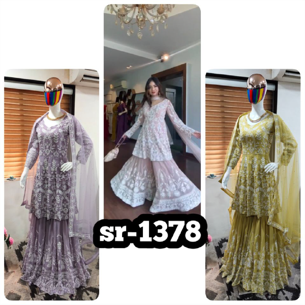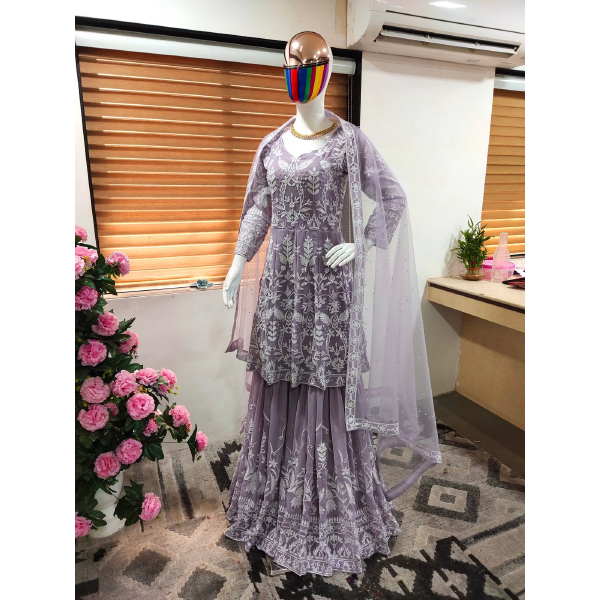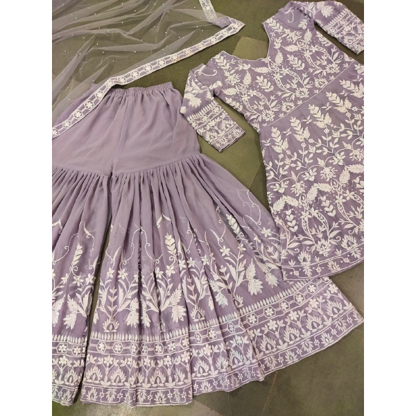 *#PLAZZO FABRICS* : FAUX GEORGETTE WITH HEAVY EMBROIDERY COTTON THREAD WORK WITH DIAMONDS HAND WORK