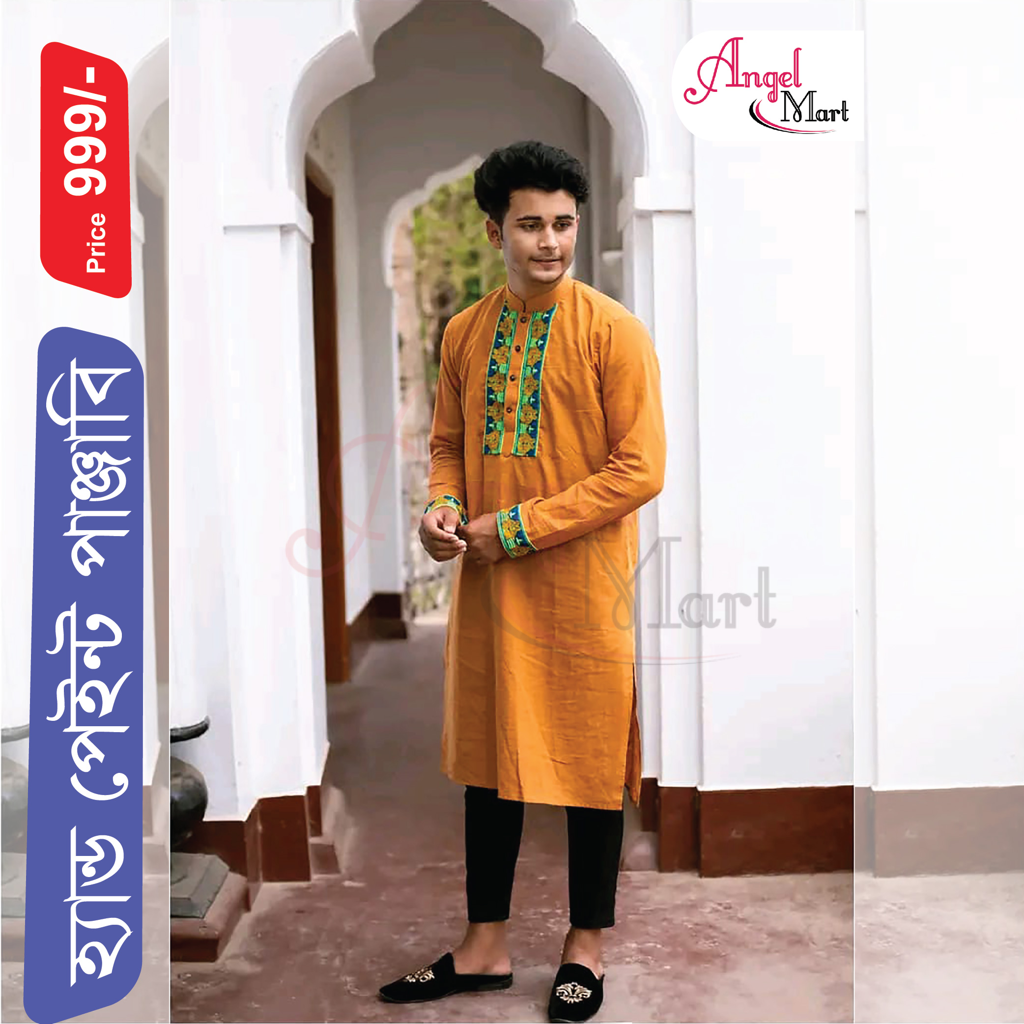 Description: ১) কুমিল্লার ঐতিহ্যবাহী খাদি হ্যান্ড পেইন্ট/প্রিন্ট পাঞ্জাবি। ২) খাদি পাঞ্জাবিতে হাতে পেইন্ট করা হয়। ৩) রঙ ওঠার কোন সম্ভাবনা নেই। ৪) কাপড়ের মান অনেক ভাল। ৫) সাইজ ৩৮, ৪০, ৪২, ৪৪, ৪৬।কুমিল্লার খাদি হ্যান্ড পেইন্ট পাঞ্জাবিঐতিহ্যের খাদির রূপ খুলছে আধুনিকতায়। আভিজাত্য কমেনি; বরং তৈরি হচ্ছে নানা রকম পোশাক। শীত শুধু নয়, গরমকালের উপযোগী পাতলা খাদিও তৈরি হচ্ছে এখন। ডিজাইনারদের হাত ধরে ঘটছে খাদির রূপান্তর। সুতা তৈরি থেকে তাঁতে কাপড় বোনা—পুরো প্রক্রিয়া হাতে হাতে। খাদি কাপড়ের মূল বৈশিষ্ট্য এটিই। এর আধুনিক উপস্থাপনায় অভিজাত ভাব কমেনি; বরং যোগ হয়েছে বৈচিত্র্য। ঐতিহ্যের ধারাও রয়েছে।ব্যবহারবিধি: হ্যান্ডপেইন্ট পাঞ্জাবিটি নেয়ার পরে কড়া রোদে ৩-৪ দিন শুকাতে হবে। এতে করে আপনার রঙয়ের টেকসই ভাল হবে। পাঞ্জাবিটি নেয়ার সাথে সাথে ব্যবহার করতে পারবেন। তবে প্রথমবার ধোয়ার আগে কমপক্ষে ৩-৪ দিন রোদে শুকাতে হবে। ডিটারজেন দিয়ে ধোয়া যাবে না। সাবান দিয়ে ধুইতে পারবেন। রঙ ওঠার কোন সম্ভাবনা নেই।