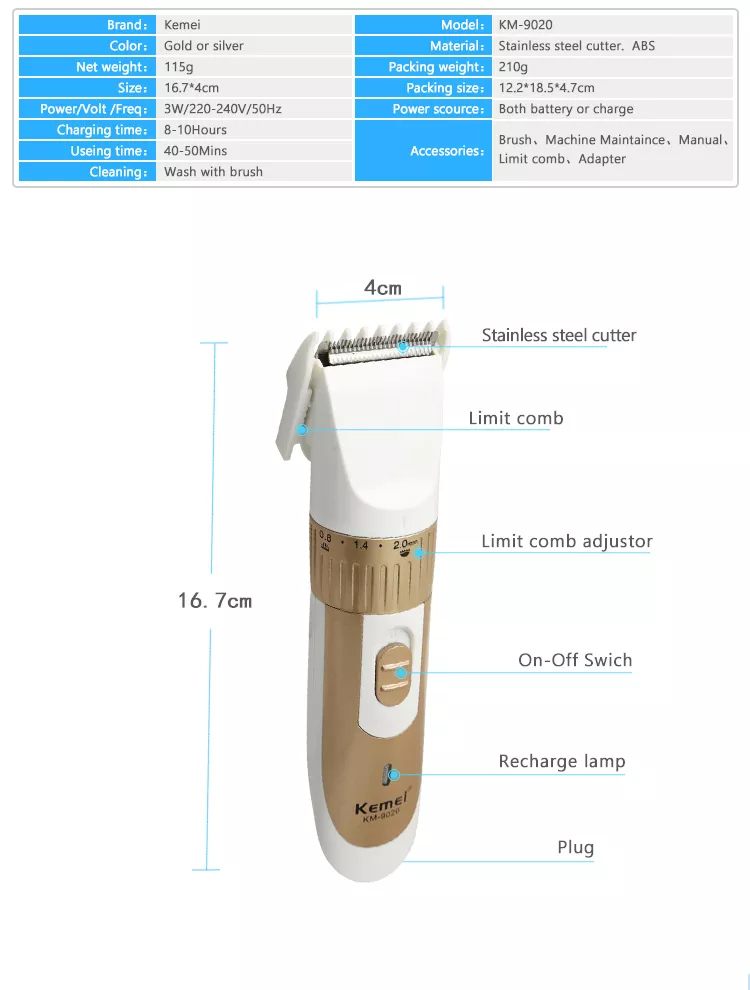 Brief Intro KM-9020 is a professional rechargeable hair clipper. It is equipped with stainless steel blade which glides smoothly on your skin. Also it is perfectly used for any length with its limit comb. It includes charging stand, power cord and cleaning brush and smooth oil etc. The blade adjusts to every curve of your face and neck. The ergonomic industrial design provides the comfortable using experience. Product Feature 1. Advanced cutting system 2. Streamlined model and ergonomic design 3. Used for any length with its limit comb 4. Mute design/ Noise lower than similar products 5. Used wirelessly, convenient to operate 6. When it is charging, the indicator light will show
